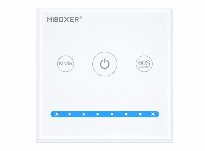 Met de dimming slider onderaan stel je het licht traploos in van 0 tot 100 procent en via de modefunctie kies je uit meerdere instellingen. De 60S-functie schakelt de verlichting automatisch uit na zestig seconden en de verlichte aan uit knop zorgt ervoor dat je de dimmer ook in het donker makkelijk terugvindt.