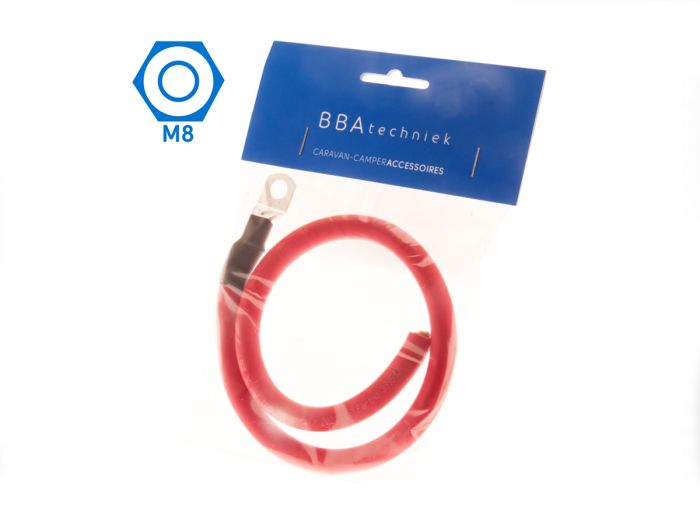 Deze voorgemonteerde kabel is uitgerust met een M8 kabeloog en krimpkous afwerking, wat zorgt voor een stevige en veilige aansluiting. De rode kleur maakt de kabel eenvoudig te identificeren tijdens installatie of onderhoud.