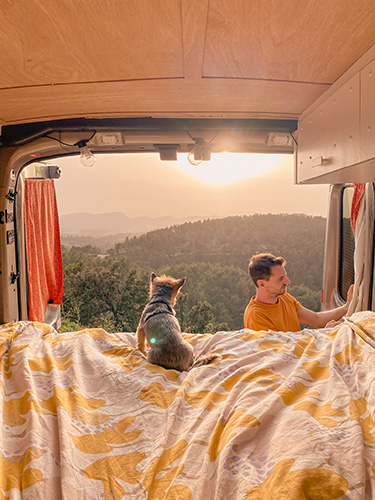 “Ellen ging als kind mee met haar ouders, die met de auto van huisje naar huisje reden om zo een land te ontdekken. Bryan reisde rond zodra hij zijn rijbewijs had. Zo goed als elk voertuig dat hij bezat, bevatte op z’n minst een matras om zo als slaapplek te kunnen dienen. Een paar jaar geleden reisde hij met een kleine Ford Transit in z’n eentje door Zweden met als inrichting een bed, gasvuurtje en bakken voor zijn kleren. Nu reizen we dus samen met een grotere Ford Transit 2T, die we hebben geüpgraded tot een soort van comfortabelere minicamper. De perfecte middenweg tussen Bryans drang naar avontuur en mijn nood aan iets meer luxe. In’t nieuwe busje hebben we eigenlijk alle comfort. Een bed, een keuken, een koelkast, stromend water en verwarming. Ook een porta potti, zodat we ’s nachts niet meer in de kou naar buiten hoeven. Met de komst van Florence moesten we terug aan de slag om alles iets handiger te maken. Zo kunnen we haar s nachts makkelijk verschonen op de nieuwe keuken en voorzagen we de bus van een extra bedje.”