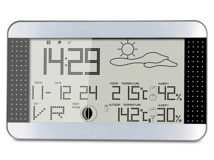De geanimeerde weersvoorspelling omvat veel informatie. Je krijgt de binnen- en buitentemperatuur en de luchtvochtigheid voor zowel binnen als buiten. Je ziet de laagste en hoogst gemeten temperatuur en luchtvochtigheid van het afgelopen etmaal. Bovendien kun je de maanstand aflezen en gaat er bij een te lage of hoge temperatuur een alarm af. Daarnaast heb je een klok met datum en alarm, een eeuwigdurende kalender en een batterij-bijna-leeg indicatie. Met Alecto kies je voor ee n doordacht en gebruiksvriendelijk product van hoge kwaliteit.