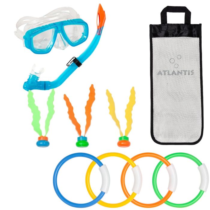 Maakt het kind vertrouwd met spelen onderwaterDuiksetje Dory van Atlantis is perfect geschikt om de motoriek van kinderen in het zwembad te verbeteren! De verschillendevormen van het duikspeelgoed uit deze setstimuleren de ontwikkeling van de motoriek en maken het kind daarnaast vertrouwd met spelen onderwater.Handige duikbril en snorkelDe duikbril uit deze set is gemaakt van PVC en heeft een verstelbare hoofdstrap. De snorkel heeft een smaller mondstuk en een dry top die voorkomt dat er spatwater in de snorkel komt. Komt er toch water in de snorkel dan blaas je dit eenvoudig uit via het waterloosventiel.Geschikt voor kinderen van 6 jaar en ouderDe ringen en het zeewier blijven rechtop staan op de bodem van het zwembad zodat ze gemakkelijk te pakken zijn. De felle kleuren vallen goed op in het water.Dit waterspeelgoed is geschikt voor kinderen van 6 jaar en ouder.Specificaties:Stimuleert de motoriekMaakt het kind vertrouwd met spelen onderwaterSet bestaat uit 1 duikbril, 1 snorkel, 3 stuks zeewier, 4 duikringen en een tasjeGeschikt voor kinderen vanaf 6 jaar