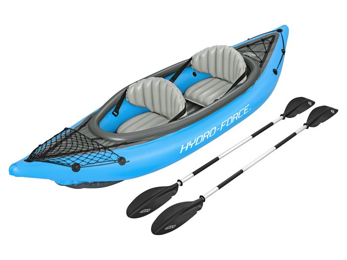Stevige 2-persoons kajak met opblaasbare bodem en afneembare vin. De Bestway Hydro force Cove Champion X2 kajak heeft een lengte van 331 cm, een breedte van 88 cm en is 45 cm hoog. De Bestway kajak heeft comfortabele opblaasbare zitjes, voor en achter bagagekoord en een grijpkoord. De Bestway kajak wordt geleverd met reparatie kit, peddels en handpomp. De opblaasbare kajak neem je makkelijk overal mee naar toe en neemt weinig opbergruimte in beslag.