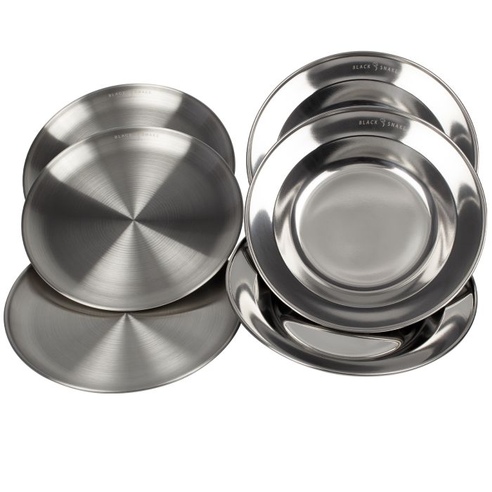 De klassiek mooie en hoogwaardige roestvrijstalen platen zijn slijtvast en bijna onverwoestbaar. Het geborstelde oppervlak is gemakkelijk schoon te maken. Door zijn eigenschappen is dit type plaat ideaal voor kampeer-, wandel- of trektochten en andere buitenactiviteiten. Een mooi en duurzaam alternatief voor plastic borden en dankzij het goede formaat van de dinerborden kan er tijdens het kamperen & Co van veel favoriete gerechten worden genoten. De set bestaat uit de platte en de diepe versie.