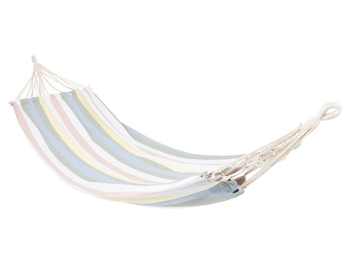 Een kleurrijke en stevige hangmat uit de Pastel collectie. Heerlijk ontspannen op vakantie, in de tuin of op het balkon. Gemaakt van stevig 320gr/m² katoen/polyester. De hangmat beschikt over een spreidstok van 100 cm aan de uiteinden waardoor de stof volledig open blijft. Maximaal draagvermogen: 150 kilogram.