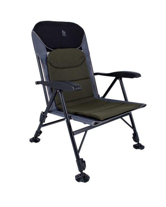 Een erg stevige en comfortabele visstoel. De bekleding is gemaakt van zeer stevig 600D Oxford Polyester en het frame van sterk staal. Voorzien van een extra brede zitting en een uitneembaar kussen. De visstoel is geschikt voor elke ondergrond door de onafhankelijke verstelbare en verstevigde voeten. De visstoel is volledig opvouwbaar.