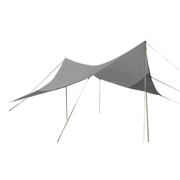 Een 4-hoekige tarp. Te gebruiken in de vorm van een ruit of in de vorm van een vierkant. Creëert snel en eenvoudig een overkapping en schaduwplek. Deze tarp is waterdicht door de 150D polyester stof met PU coating en een waterkolom van 2000 mm en voorzien van een UV-werende coating. Makkelijk op de gewenste locatie op te hangen met de meegeleverde scheerlijnen en haringen. Inclusief handige draagtas (exclusief tarpstokken).