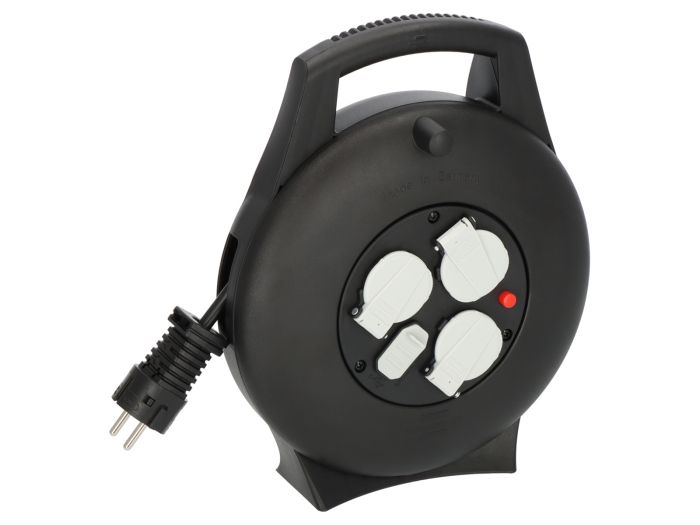 De kabelhaspel beschikt over drie beschermde contactdozen en zelfsluitende deksels. Dankzij de oververhittingsbeveiliging is hij veilig in gebruik.