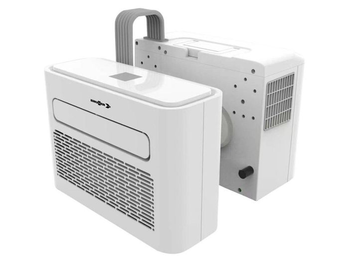 De airconditioning Polarys Twinair 3000 bestaat uit twee units: een binnenunit die de lucht koelt en een buitenunit die de warmte afvoert. De twee units zijn verbonden door een flexibele slang, waardoor de airconditioning eenvoudig en snel kan worden geïnstalleerd.