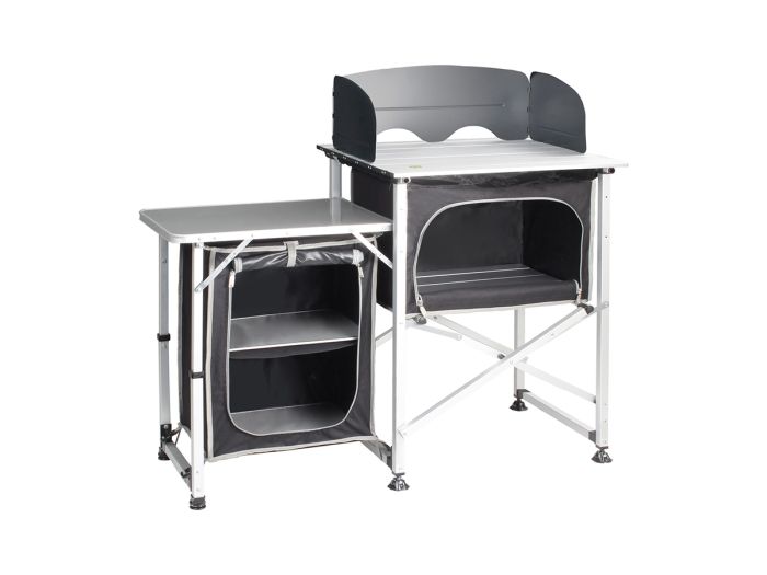 Omvattende bescherming: De geïntegreerde windscherm en spatscherm vormen een beschermende barrière rond je veldkeuken en beschermen je tegen wind en spetters. Je kunt ontspannen koken, zelfs bij ongunstige weersomstandigheden.
