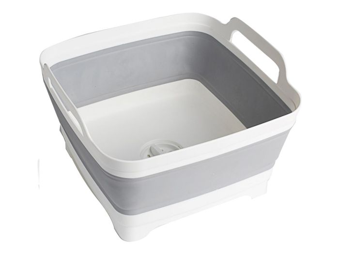 Opvouwbare wasbak gemaakt van sterk plastic met geïntegreerde handgrepen en een afvoerputje die dicht kan. Het praktische Fold-Away systeem zorgt ervoor dat de wasbak compact opgevouwen kan worden en daardoor ruimte bespaart bij het opslaan van de wasbak.