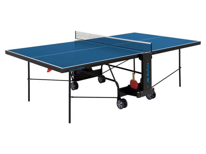 De Nordic Indoor tafel van Buffalo is een stevige kwaliteit tafeltennistafel in wedstrijdformaat, met een prachtig design. De Nordic is uitgerust met strakke witte bladlijsten voor extra stevigheid en bescherming van de bladranden, en extra dwarsverbindingen in het frame. Daarbij is de Nordic afgewerkt met een sidebar met groot Buffalo logo en industriële elementen. Eenvoudig opklapbaar en verrijdbaar, hoeft deze tafel niet permanent opgesteld te zijn. Handig in geval van beperkte ruimte. Indien opgesteld moet u rekening houden met een vrije speelruimte van minimaal 3 bij 5 meter. Voorzien van grote dubbele zwenkwielen met rubber coating, bal- en bathouders aan beide kanten en een compact onderstel (ruimtebesparing). Geleverd inclusief net (Club EN Stationary), en exclusief bats en ballen. Bats en ballen zijn afzonderlijk verkrijgbaar op onze site. Tafeltennis is de perfecte combinatie van sport en spel! Wij leveren ook outdoormodellen voor buitengebruik.