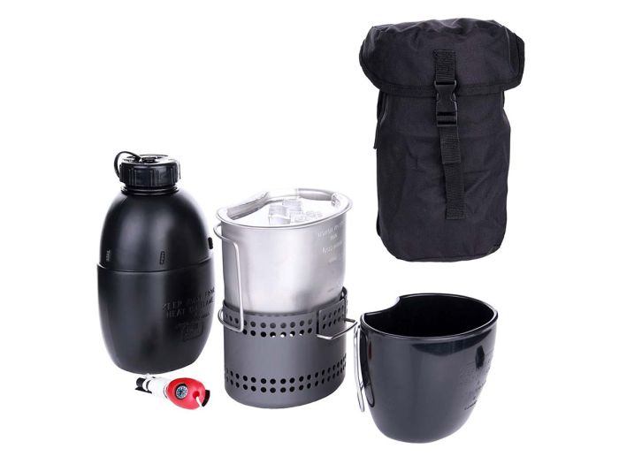 Het Bushcraft-kooksysteem Dragon met waterfles Multi-fuel - Zwart is een volledig lichtgewicht kooksysteem dat handig is verpakt in een hoes.