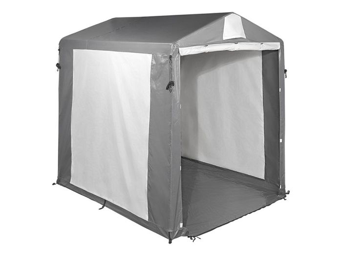 Deze schuurtent naast de (voor)tent, camper of caravan is ideaal voor kampeerders met een vaste of seizoenplek. De schuurtent kan gebruikt worden voor het stallen van je fietsen en biedt extra opslagruimte voor bijvoorbeeld de barbecue, bolderkar of speelgoed van de kinderen. Met deze bijzettent houd je je leefruimte vrij van opslag en de spullen staan evengoed droog en uit het zicht. Je kunt de schuurtent ook als keukentent of toilettent gebruiken, als je eigen voortent niet groot genoeg is of als je reist zonder voortent. Deze schuurtent is gemaakt van PVC materiaal en voorzien van nokventilatie, solide spriaal ritsen en een stevig 25/22 mm stalen frame. De stahoogte is 180 tot 210 cm en de oppervlakte is 200 x 165 cm, dus ruim genoeg voor 3 à 4 fietsen. De schuurtent wordt compleet geleverd met scheerlijnen, haringen en opbergtas.