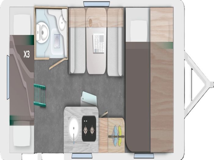 Midden toilet, Middendinette, Middenkeuken, Slaapbank, Treinzit, Vast bed, Dwars bed, Dwars stapelbed, Kledingkast