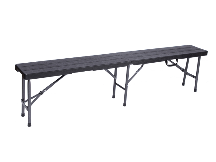 Inklapbare tuinbank voor binnen en buiten. De bank heeft een houtlook en is zwart van kleur. Opgeklapt is de bank slechts 90x25x9 cm en dankzij het handvat is deze gemakkelijk mee te nemen. De bank heeft een stevig stalen frame maar is toch licht van gewicht. De poten kunnen vastgezet worden met pinnen, zodat de bank stabiel blijft bij gebruik. Daarnaast hebben de poten rubberen doppen, zodat de ondergrond niet wordt beschadigd.