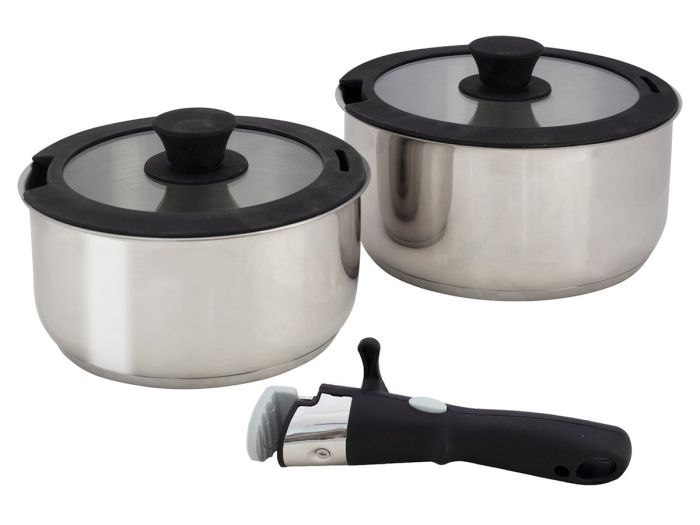 Luxe RVS pannenset met siliconen rand afgewerkte glazen deksel. De pannen zijn nestbaar en voorzien van een afneembare greep zodat ze nagenoeg overal zijn op te bergen. De speciale greep laat zich eenvoudig afnemen dmv van een uniek klik systeem en zorgt voor een stabiel greep op de pannen. Doordat de greep afneembaar is zijn de pannen ook geschikt voor gebruik in de oven! Aan de binnenzijde van de pannen staat een handige maatverdeling waardoor u precies de hoeveelheid kunt zien. Het deksel is gemaakt van gehard glas met siliconen rand en knop. De pannen passen in elkaar en nemen daardoor weinig ruimte in. De capsule bodem zorgt ervoor dat ze geschikt zijn voor alle hittebronnen zoals gas, elektrisch, keramisch of inductie.