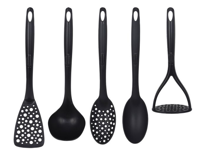 Deze set bevat onmisbare keukenhulpjes die je dagelijks gebruikt bij het koken, roeren en serveren. Dankzij het tijdloze zwarte design past deze set moeiteloos in elke keukenstijl, van modern tot klassiek. Met een compacte afmeting van 31 x 10 cm zijn de keukentools eenvoudig op te bergen en toch groot genoeg voor comfortabel gebruik. Gemaakt van duurzaam materiaal en ontworpen voor gebruiksgemak, zijn deze tools ideaal voor zowel beginnende thuiskoks als ervaren keukenliefhebbers.