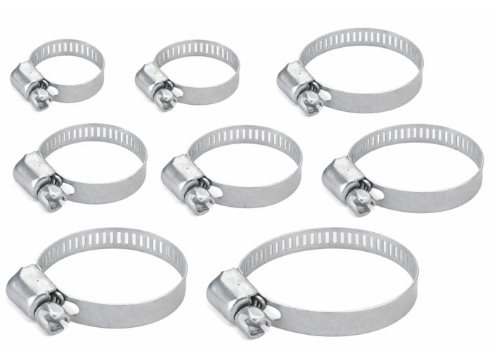 In deze set zitten slangklemmen in de maten 16 mm, 19 mm, 20 mm, 23 mm, 25 mm, 26 mm, 31 mm en 37 mm, allemaal optisch gelijk uitgevoerd zodat je direct ziet dat het om één complete set gaat.