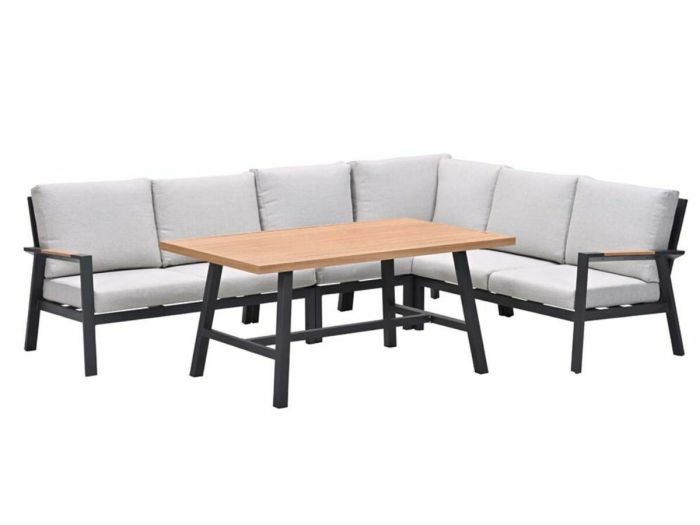 De Lissabon lounge dining set 5-delig is een strakke loungeset met een hoge zit. De lounge dining set is prachtig afgewerkt met teak look details. De loungebank set is zowel links als rechts op te stellen.
