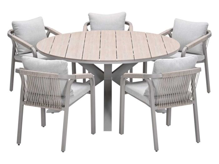 De tuinstoel heeft een afmeting van 60 bij 64 cm en is 75 cm hoog. De tuintafel is Ø148 cm en heeft een hoogte van 75 cm. Het tafelblad is gemaakt van Vironwood latten, dit is een onderhoudsvriendelijke kunststof met een mooie houtuitstraling.