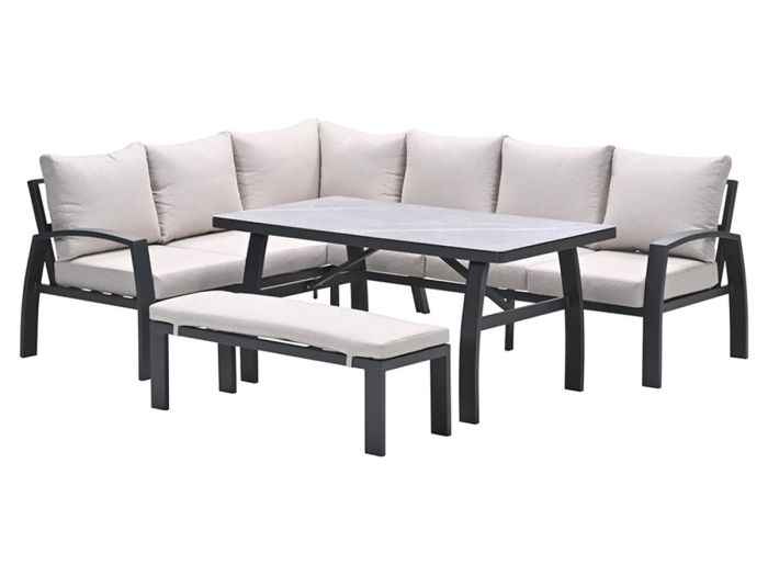 De lounge-diningset bestaat uit vier delen: twee bankdelen, een tafel en een bijpassend bankje. De twee bankdelen vormen samen een hoekbank in L-vorm. Lounge-dining betekent dat de zithoogte van de bank en de hoogte van de tafel perfect zijn om zowel comfortabel aan te eten als lekker te loungen. De Vasano lounge-diningset heeft een lichtgewicht aluminium frame, afgewerkt met een beschermende poedercoating. Het tafelblad is gemaakt van veiligheidsglas met een keramiek-look coating, wat zorgt voor een warme uitstraling. Bovendien is het onderhoud eenvoudig: je kunt keramisch glas makkelijk schoonmaken met een sopje. De heerlijke kussens van de Vasano set zijn gemaakt van waterafstotend polyester. Dit doet niets af aan het zitcomfort, maar zorgt ervoor dat je eenvoudig enkele druppels water van de kussens kunt afkloppen. Bij slecht weer raden we aan de kussens op een warme, droge plek op te bergen, aangezien ze niet volledig waterdicht zijn. De afmetingen van de Vasano hoekbank zijn 254 x 198 x H78,5 cm, met een zithoogte van 43 cm. De tafel heeft een afmeting van 150 x 80 x H69 cm en het bankje meet 120 x 40 x H40 cm.