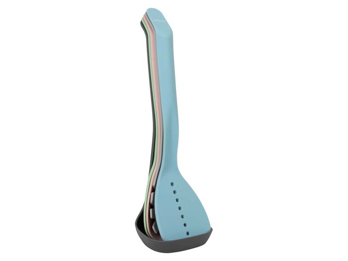 Een stijlvolle keukengerei set in verschillende pastel kleuren. Deze set bestaat uit 2x opscheplepel, soeplepel, pastalepel en een bakspaan. Bovendien is deze keukengerei set geschikt voor in de vaatwasser. Afmeting: 32 cm