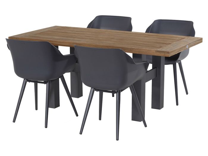 De Hartman Sophie studio Yasmani 180 diningset heeft een mooie robuuste houten tafel met daaromheen vier kuipstoelen.