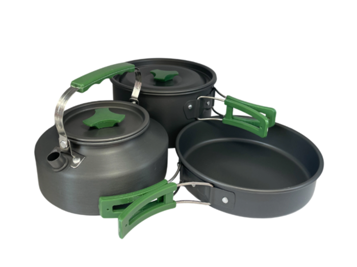 De set is licht van gewicht, compact op te bergen en gemaakt van hoogwaardig aluminium dat snel en gelijkmatig opwarmt – ideaal voor koken in de buitenlucht.