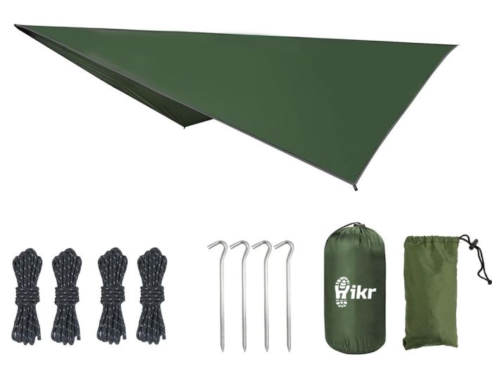 De Hikr Hangmat Tarp is ontwikkeld met aandacht voor gebruiksgemak en duurzaamheid. Door het lage gewicht en het kleine pakformaat neem je hem moeiteloos mee op iedere hike of kampeertocht. Bij wisselvallig weer zorgt het doek voor consistente bescherming — of het nu regent of de zon fel schijnt. De bijgeleverde haringen, scheerlijnen en opbergzak zorgen ervoor dat je altijd klaar bent om de tarp stabiel en strak op te zetten. In combinatie met de Hikr Hangmat Treewolf-series vormt hij een perfect geheel, zodat je comfortabel en droog onder de sterren kunt slapen.