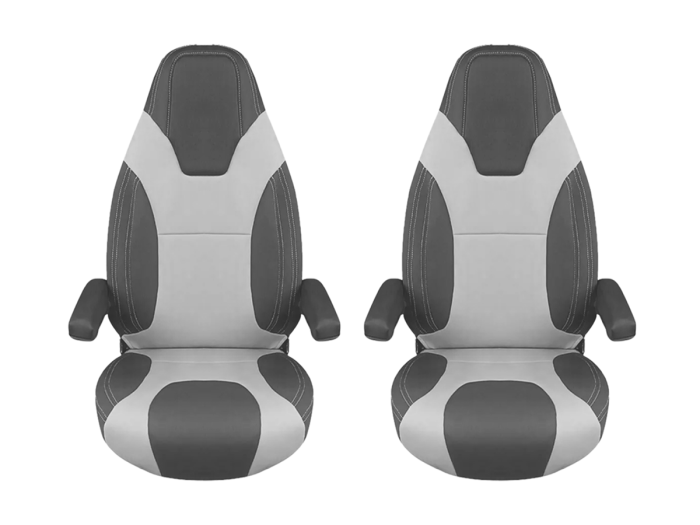 Paar hoezen voor campers en kampeerwagens op de basis van de Ducato Capitan stoel. Het is een hoes die exclusief voor dit stoelmodel op maat is gemaakt, met een uitstekende afwerking en zonder het uiterlijk van de originele stoel te veranderen. De visco-elastische hoofdsteun en de speciale vulling aan de basis van de stoel maken je reizen aangenamer.