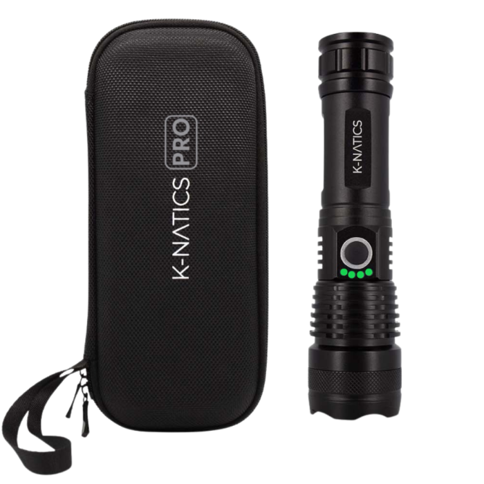 Met de K-NATICS PRO hoef je nooit meer bang te zijn in het donker! Schijn tot wel 800 meter ver met deze revolutionaire oplaadbare zaklamp! Deze K-NATICS stof- en waterdichte militaire zaklamp heeft in zijn felste stand een lichtopbrengst van 2500 lumen. Heb je de meegeleverde K-NATICS 5000mA ULTRA batterij helemaal opgeladen? Dan gaat hij in zijn felste stand maar liefst 7 uur mee en in zijn laagste(50%) zelfs 20 uur! Maak je nooit meer zorgen dat je tijdens jouw nachtwandeling of survivaltrip in het donker komt te zitten. Naast de ultra sterke batterij, wordt deze zaklamp geleverd in een stevige foamcase, een handig opbergzakje en een USB-C laadkabel.