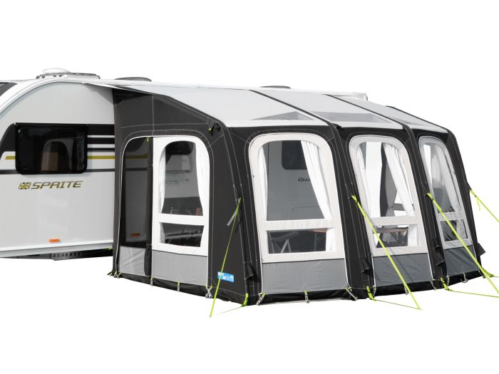 De Kampa Ace AIR Pro 400 is een lichtgewicht opblaasbare voortent met voorgevormde voorpanelen. Deze zien er niet alleen goed uit, maar bieden ook nog extra diepte aan de binnenkant. Als je van binnen naar buiten kijkt, heb je door de grote, panoramische ramen een prachtig uitzicht en de dakramen laten overdag volop daglicht door. De Ace AIR is gemaakt van het Pro Weathershield® Pro-materiaal. Dit staat niet alleen mooi bij uw caravan, maar is ook nog eens zeer sterk en bestand tegen alle weersomstandigheden. De Ace Air 400 is uitgerust met het nieuwe Dual-Pitch-daksysteem en één zijpaneel is nu voorzien van een groot horpaneel dat kan worden geopend bij warm weer. Als je het gewicht niet kan tillen, kunnen de zijwanden worden verwijderd. Je hoeft dan alleen het dak door de tentrail te schuiven.