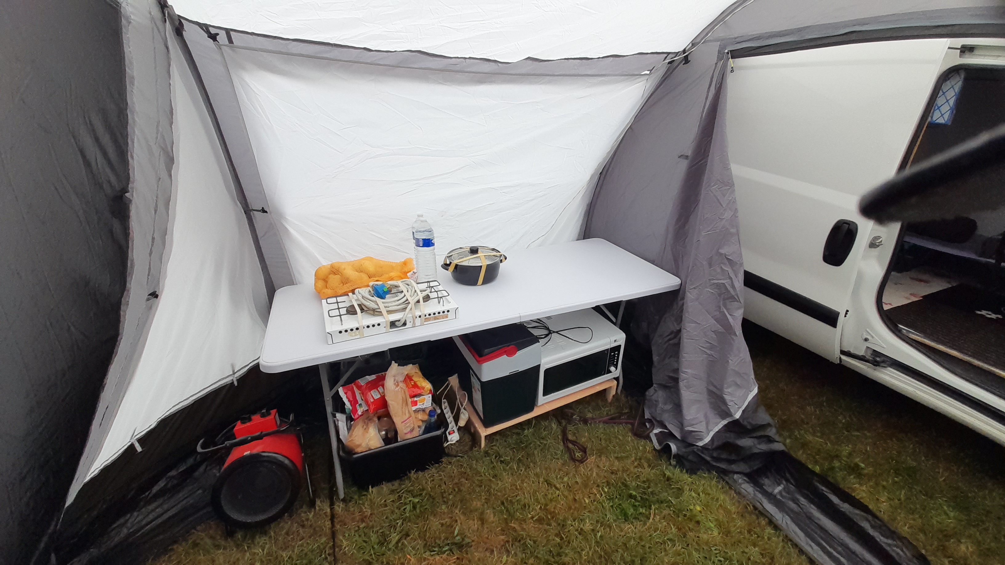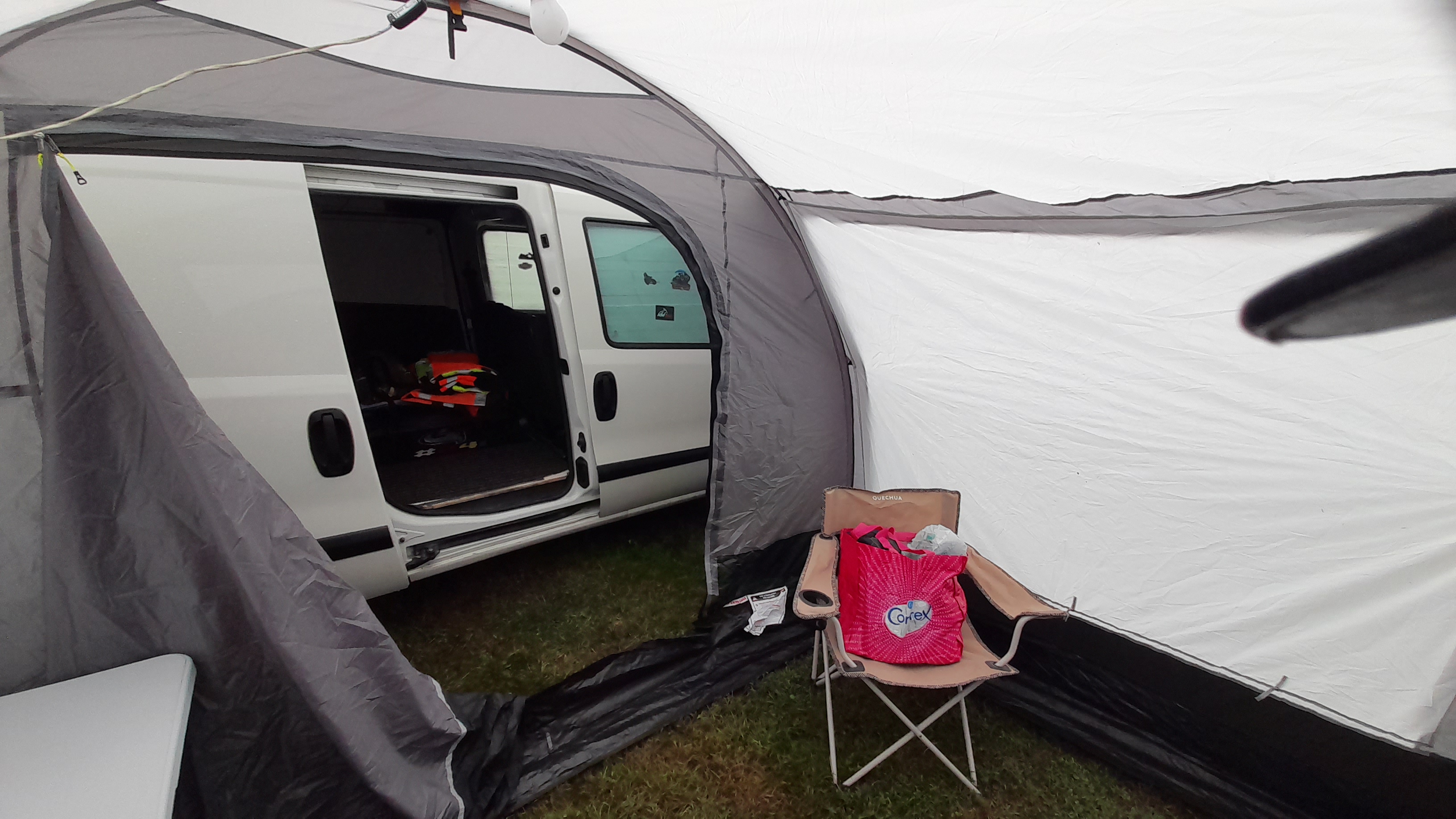 Dit is de (overdekte) ruimte tussen de tent en het voertuig.