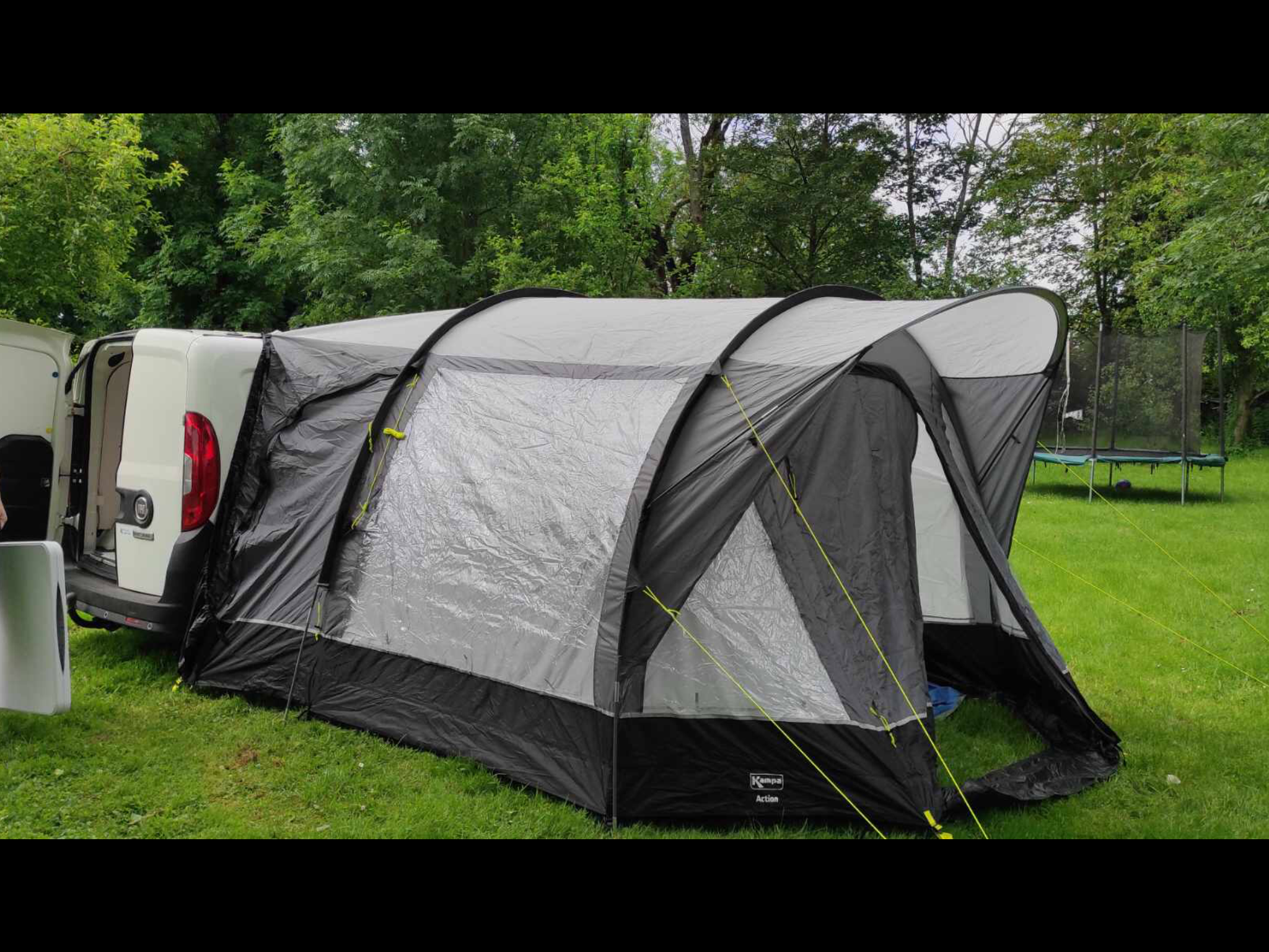 - Tres bel auventJ’ai mis , seul , environ 40 min pour le monter la première fois donc moins de temps avec l’habitude. . Bel espace de vie , sas tres pratique . Bien adapté avec mon Fiat doblo maxi .