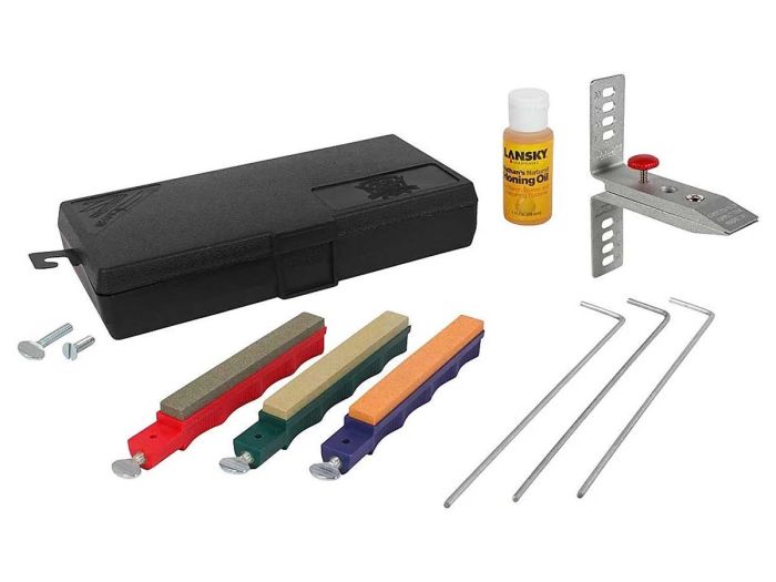 De standaardset met drie verschillende wetstenen (grof, medium, fijn) van Lansky. Deze set zorgt voor precies dezelfde slijphoek om een lemmet de finishing touch te geven. Het mes wordt met de rug in de klem geklemd. De geleidingsgleuven in de klem zorgen ervoor dat altijd dezelfde slijphoek wordt aangehouden.