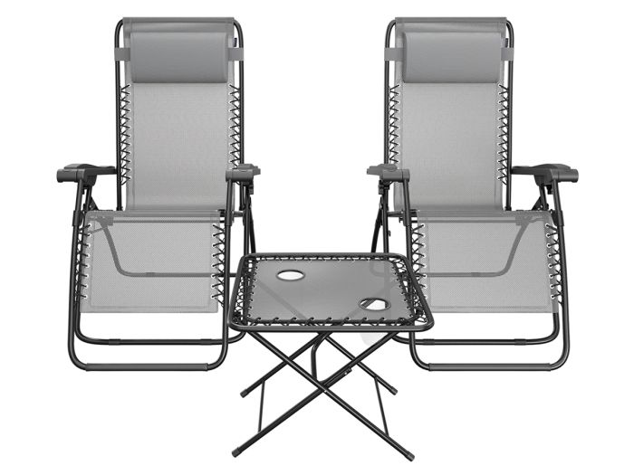 - Complete set: Twee opvouwbare ligstoelen én handige bijzettafel met twee vakken