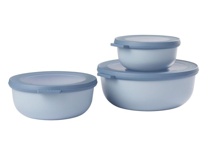 Met deze Mepal Cirqula multikommen set in de kleur Nordic blue heb je echte alleskunners in de keuken. In de multikommen, in de maten 350 ml , 750 ml en 1250 ml, kun je eten bewaren, invriezen én opwarmen. De praktische formaten maken deze set ideaal voor het bewaren van restjes eten, wat soep, een kleine maaltijdsalade of babyhapjes. De Mepal Cirqula multikom is gemaakt van robuust materiaal. Dankzij het transparante venster in de deksel blijft de inhoud goed zichtbaar. De deksel is 100% luchtdicht en lekvrij, zodat je eten langer vers houdt en makkelijk meeneemt. De multikommen berg je gemakkelijk op, omdat je ze op en in elkaar weg kunt zetten.