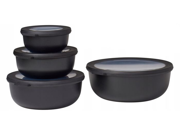 Met deze Mepal Cirqula multikommen set in de kleur Nordic black heb je echte alleskunners in de keuken. In de multikommen, in de maten 350 ml , 750 ml, 1250 ml en 2250 ml, kun je eten bewaren, invriezen én opwarmen. De praktische formaten maken deze set ideaal voor het bewaren van restjes eten, wat soep, een kleine maaltijdsalade of babyhapjes. De Mepal Cirqula multikom is gemaakt van robuust materiaal. Dankzij het transparante venster in de deksel blijft de inhoud goed zichtbaar. De deksel is 100% luchtdicht en lekvrij, zodat je eten langer vers houdt en makkelijk meeneemt. De multikommen berg je gemakkelijk op, omdat je ze op en in elkaar weg kunt zetten.