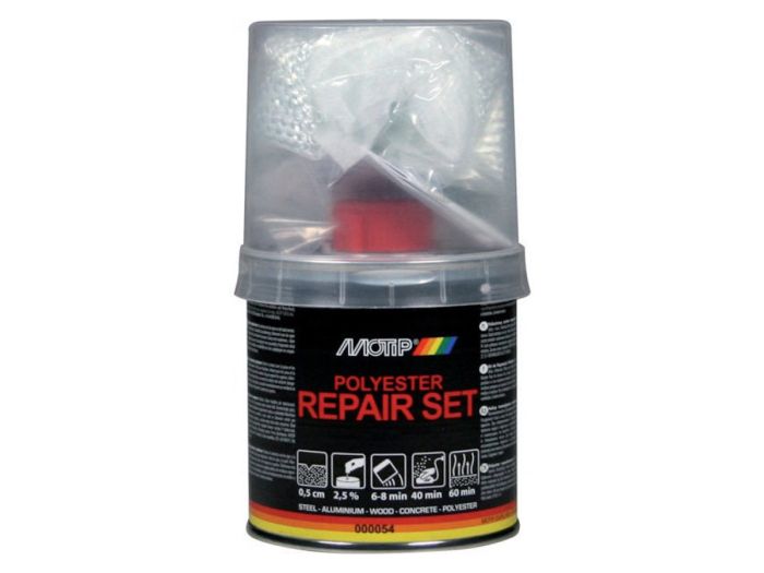 De Motip polyester reparatie set is een 2-componenten polyester hars en is te gebruiken in combinatie met bijgevoegde glasvezelmat en glasvezelvlies. Je kunt de reperatie set gebruiken voor het dichten van gaten in ondergronden zoals staal, aluminium, hout, beton en polyester. Buiten dat is de reperatie set geschikt voor het repareren van voorwerpen, waarbij een mal gebruikt wordt.