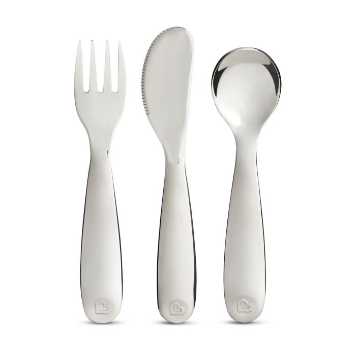Het Munchkin RVS besteksetje is gemaakt van zilver en roest niet. Het bestaat uit een mesje, vorkje en lepeltje. Deze zijn mooi afgerond zodat het kind zich geen pijn kan doen. Het kind zal hier graag van willen eten.