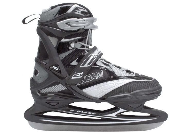 Polyester mesh/PU nubuck softboot met piping, vetersluiting, wreefband met klittenbandsluiting en 1x 2 delige snelsluiting met veersluiting, PP enkel-, hielkap en PVC teenkap, S-blade synthetische schaatshouder met roestvrij stalen ijshockeyschaatsijzers