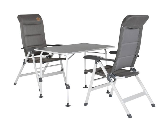 Met deze Obelink Abruzzo Superlight 100 tafel en de twee Corsa Grey stoelen heb je een lichtgewicht, sterke en comfortabele combinatie voor op de camping, in de tuin of op het balkon.