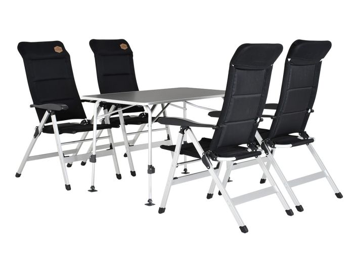 Deze Obelink tafel met standenstoelenset bestaat uit de Obelink Abruzzo Superlight 120 campingtafel en vier comfortabele Obelink Corsa standenstoelen - Black. Ideaal als je in één keer een complete, comfortabele campingset wilt.