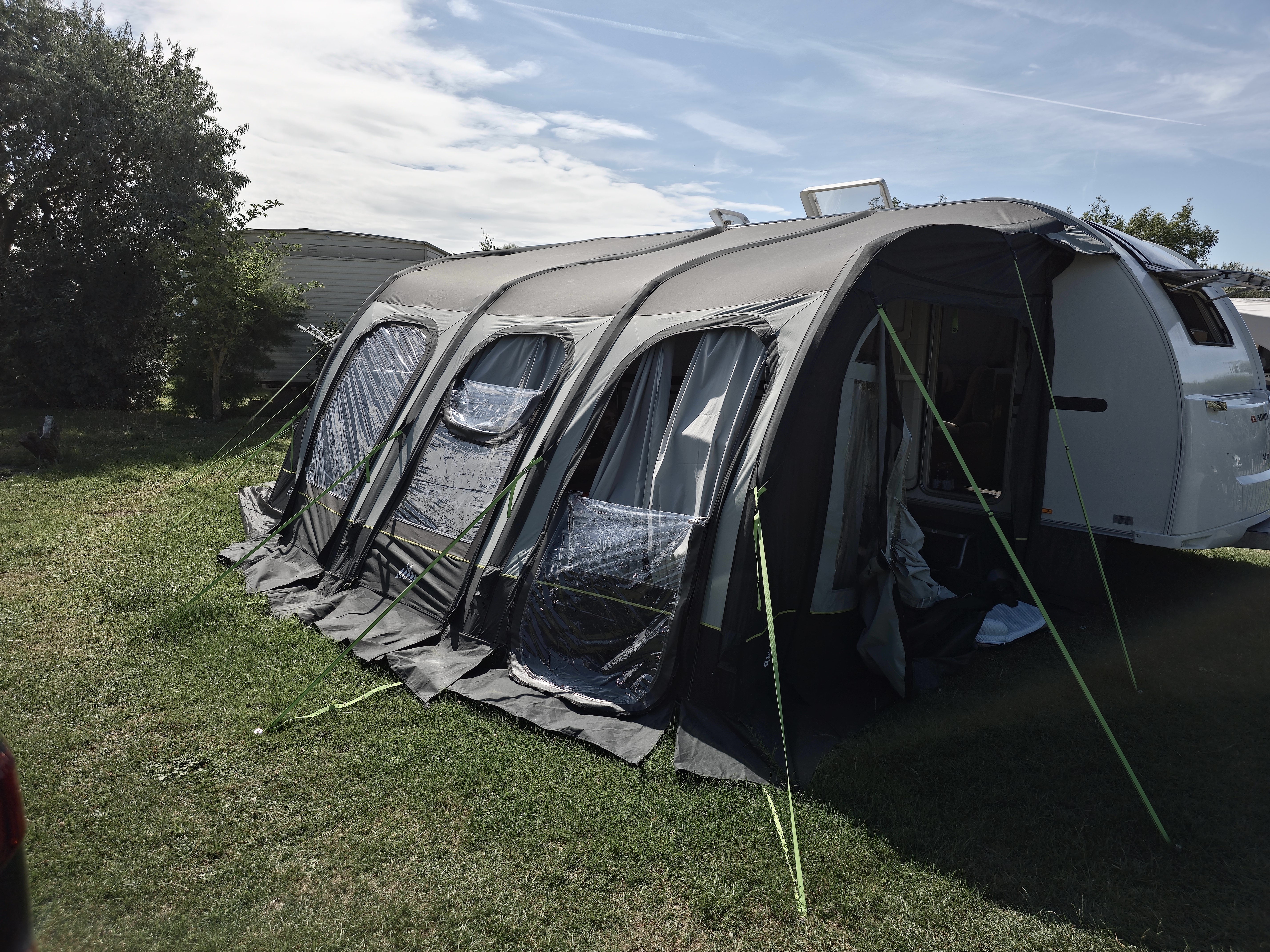 Deze tent, voortent of luifel is voorzien van opblaasbare luchtslangen i.p.v. tentstokken.
