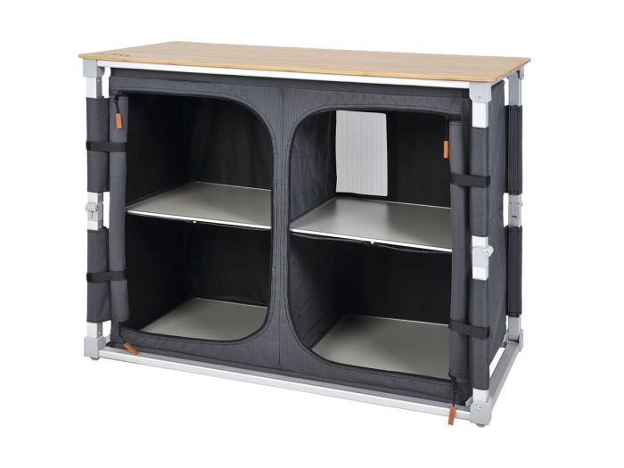 De Obelink Bamboo Quick - XL heeft vier ruime opbergvakken waarin je jouw kampeeruitrusting overzichtelijk kunt opbergen. De achterzijde is voorzien van mesh gaas dat ervoor zorgt dat de kast goed geventileerd wordt. De kast heeft een aluminium frame en een bovenblad van bamboe. Bamboe is niet hittebestendig. Wil je toch koken op de kast, zorg er dan voor dat de hittebron het blad niet direct raakt.