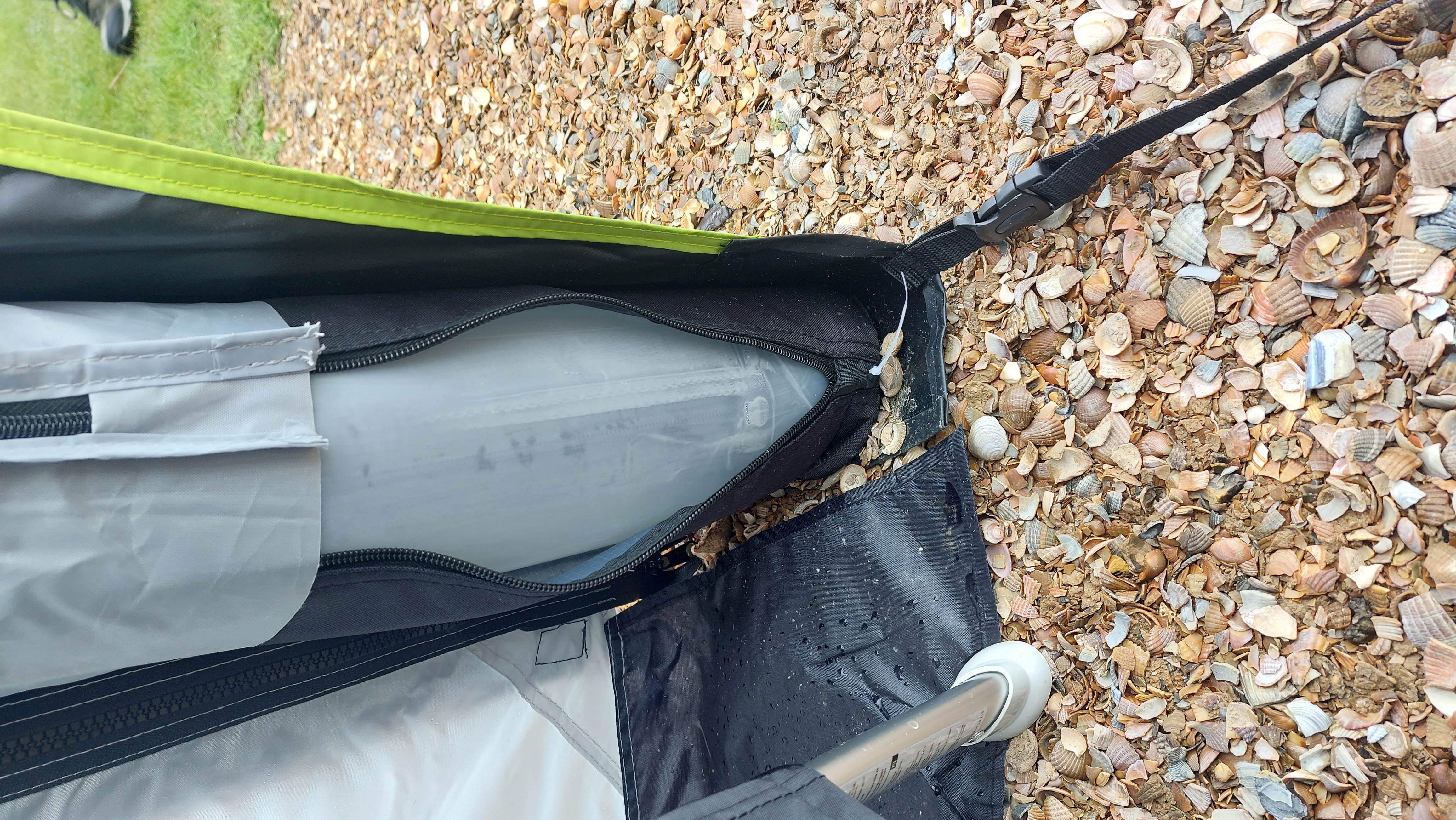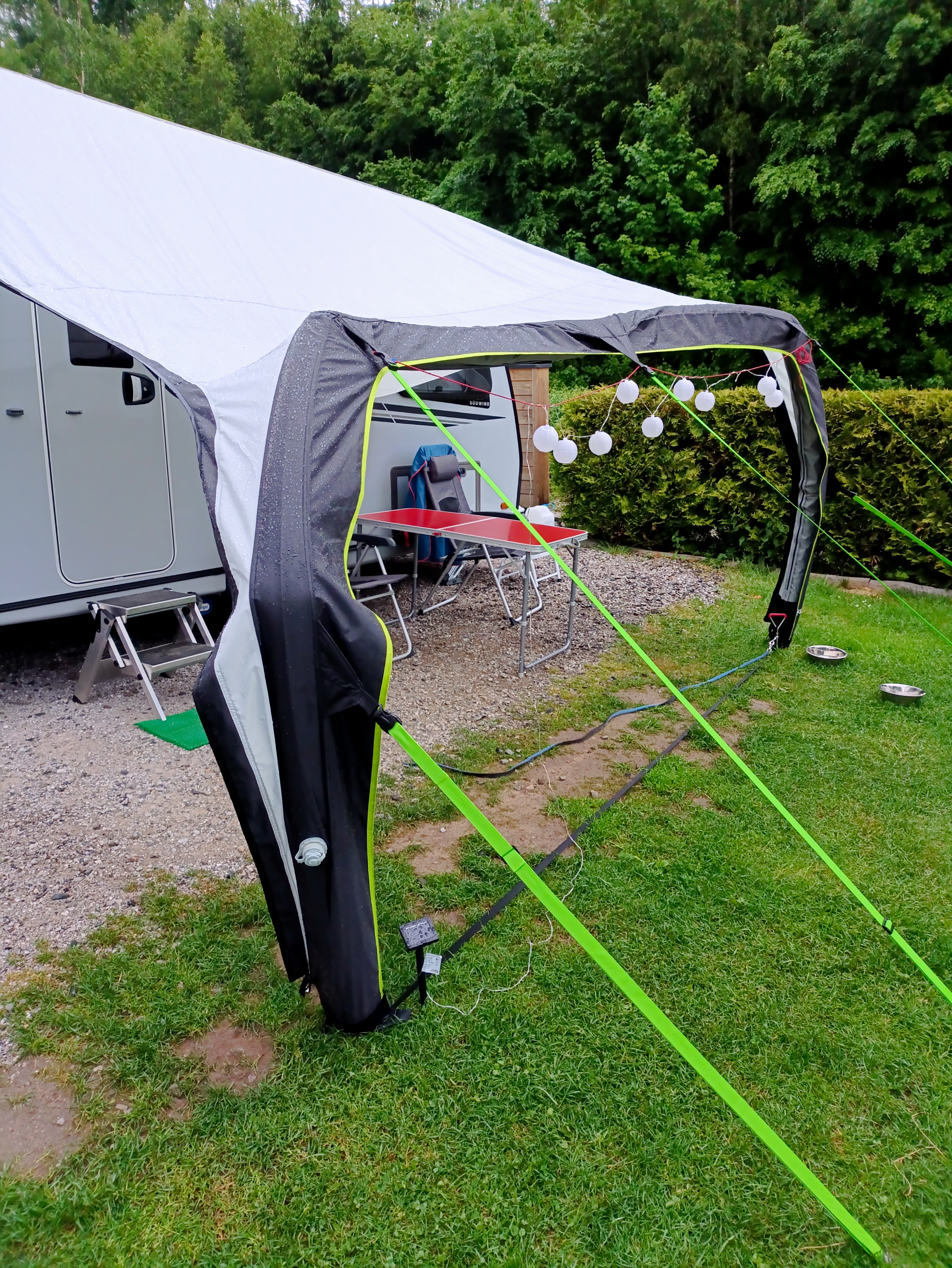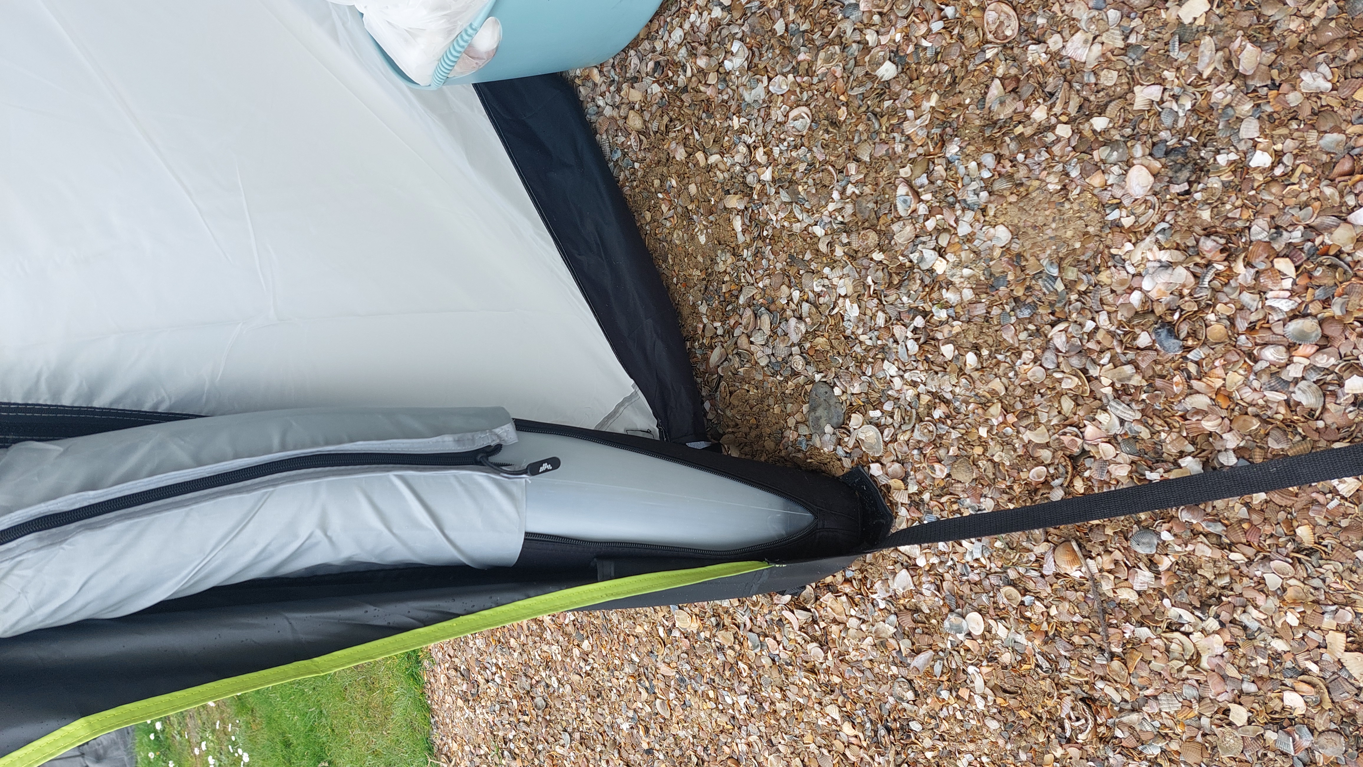 Deze tent, voortent of luifel is voorzien van opblaasbare luchtslangen i.p.v. tentstokken.