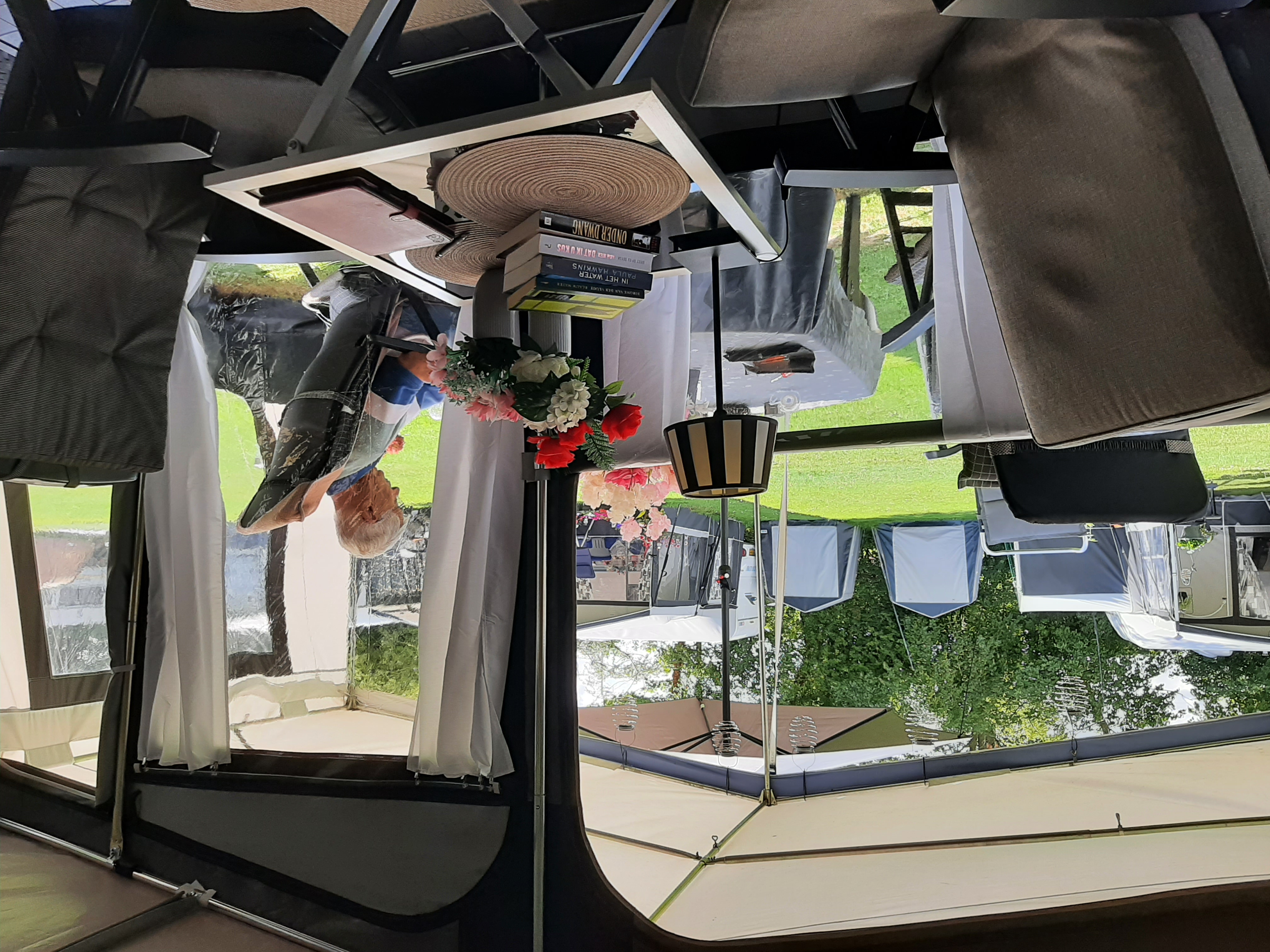 Deze tent, voortent of luifel is voorzien van opblaasbare luchtslangen i.p.v. tentstokken.