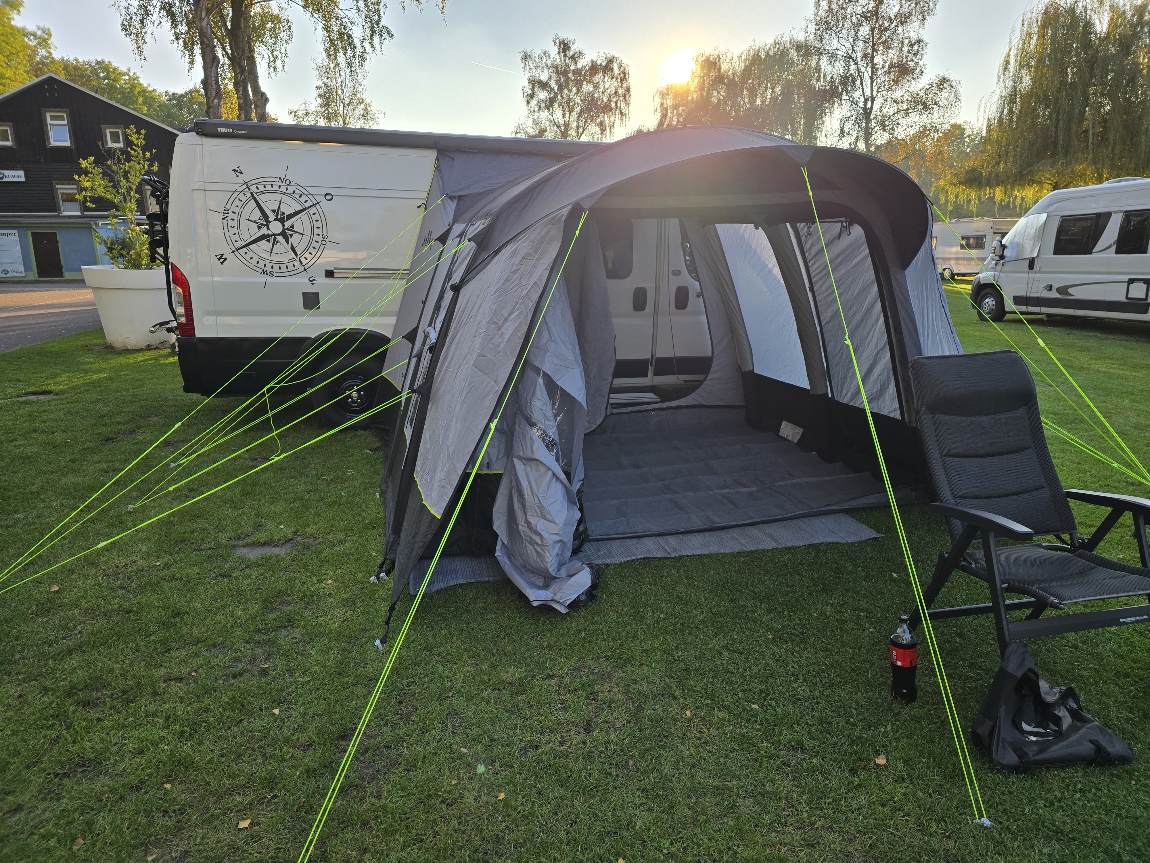 Dit is de (overdekte) ruimte tussen de tent en het voertuig.