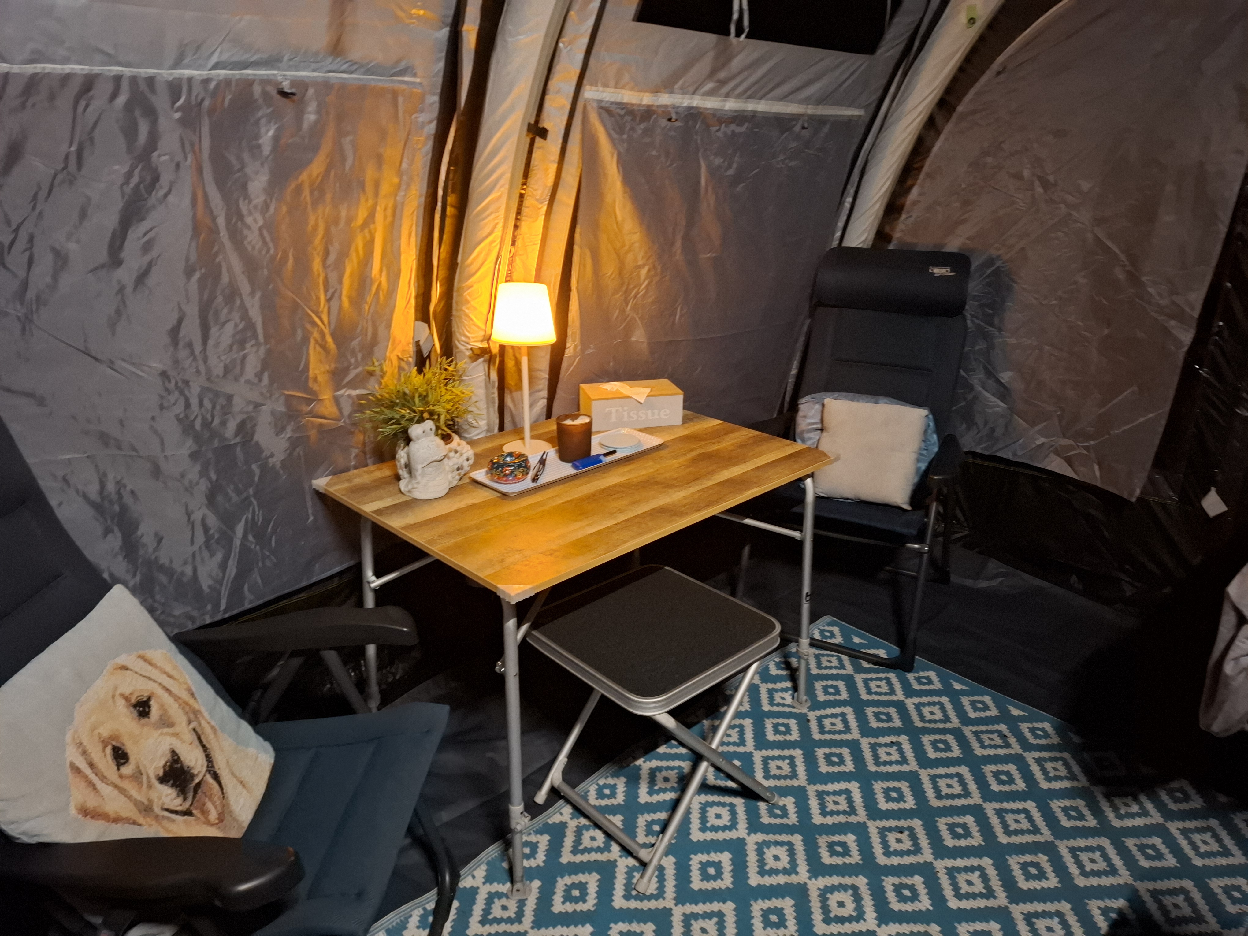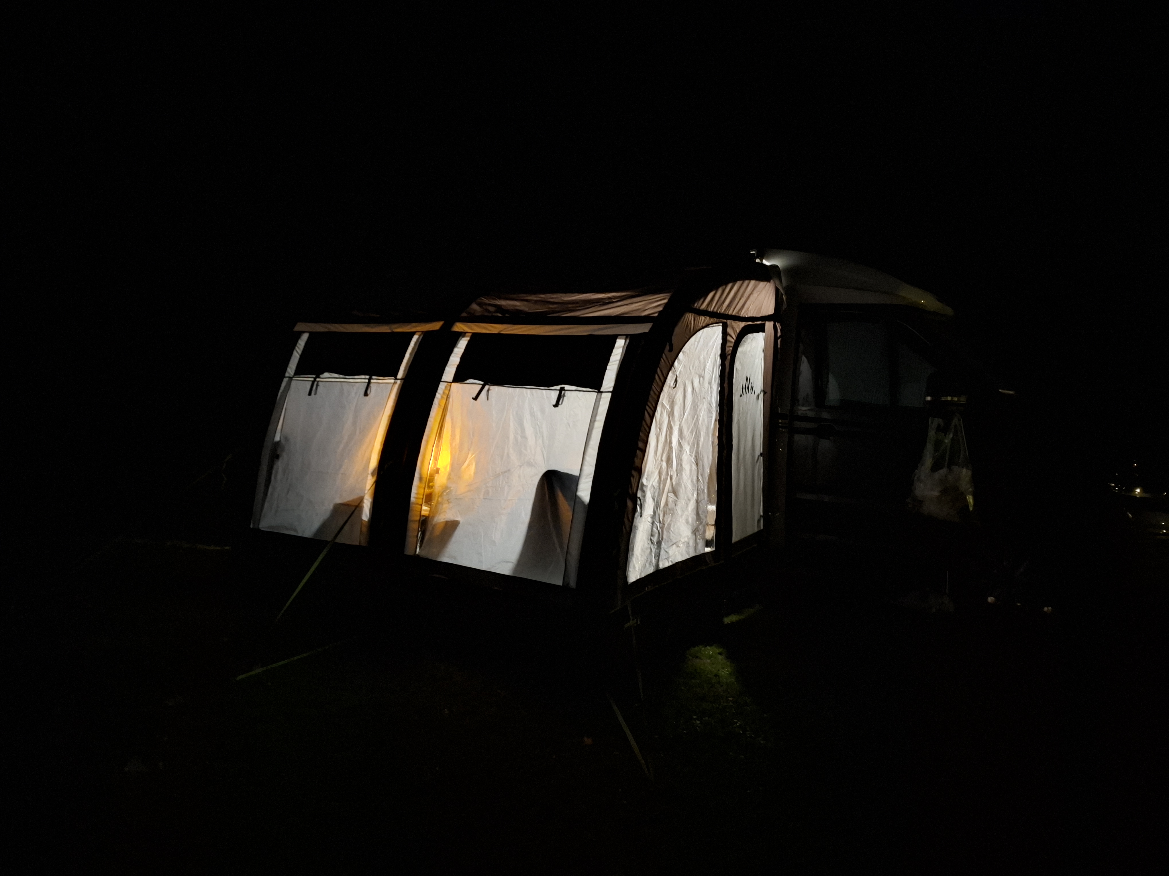 Deze tent, voortent of luifel is voorzien van opblaasbare luchtslangen i.p.v. tentstokken.