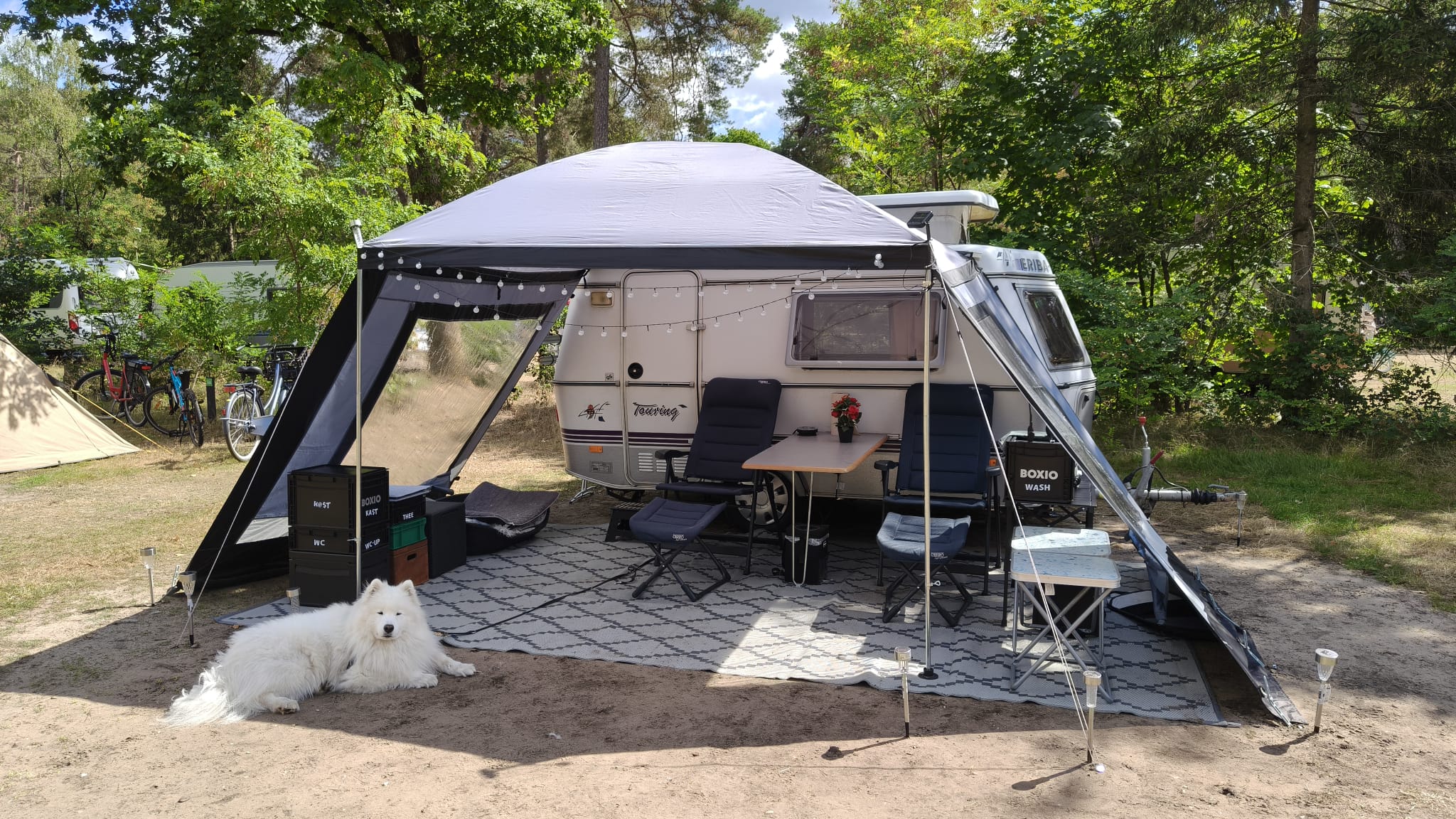 Een vrijstaande tent kan ook zonder camper of bus blijven staan. Dit is vooral handig wanneer je op pad gaat, maar de tent niet wilt afbreken.